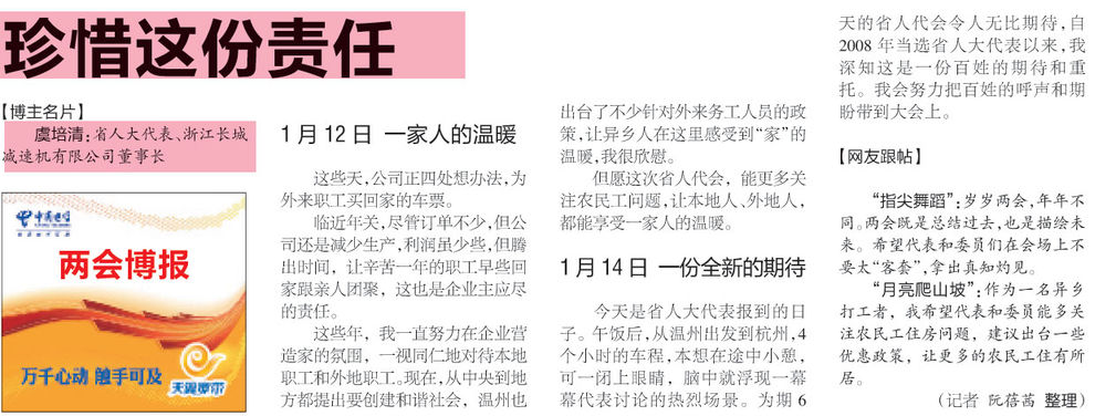 今天是省人大代表報(bào)到的日子。午飯后,從溫州出發(fā)到杭州,4個(gè)小時(shí)的車程,本想在途中小憩,可一閉上眼睛,腦中就浮現(xiàn)一幕幕代表討論的熱烈場(chǎng)景。為期6天的省人代會(huì)令人無(wú)比期待,自2008年當(dāng)選省人大代表以來(lái),我深知這是一份百姓的期待和重托。我會(huì)努力把百姓的呼聲和期盼帶到大會(huì)上。