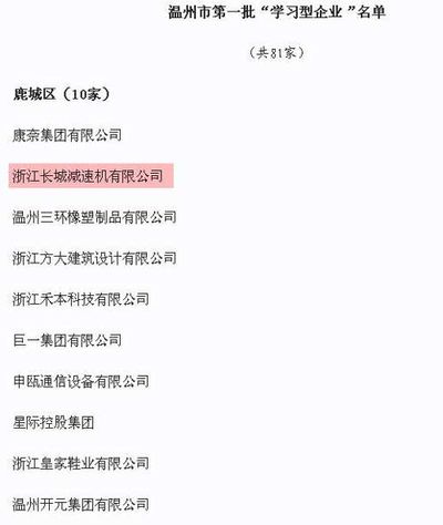 日前,溫州市創(chuàng)建學(xué)習(xí)型黨組織工作領(lǐng)導(dǎo)小組辦公室對(duì)在各縣(市、區(qū))開展學(xué)習(xí)型企業(yè)創(chuàng)建工作中涌現(xiàn)出的先進(jìn)單位進(jìn)行表彰。我公司被授予溫州市第一批“學(xué)習(xí)型企業(yè)”榮譽(yù)稱號(hào)。