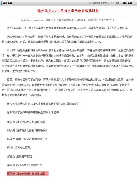 據(jù)溫州商人網(wǎng)—溫州商報(bào)報(bào)道,溫州市政府辦公室近日公布了溫州首次享受政府特殊津貼民企高層人才名單,我公司副總周國忠博士名列榜單。