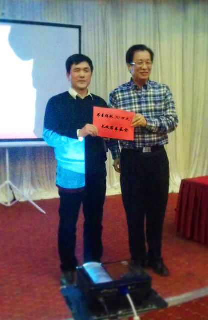 2013年1月4日我公司在溫州米蘭國際大酒店舉行迎春晚宴,在晚宴上公司董事長虞培清決定成立長城慈善基金會,下圖是虞董(右)現場給鹿城區慈善總會捐款30萬元。