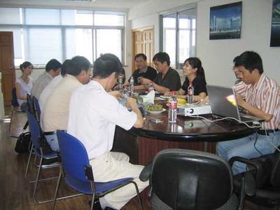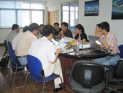 總經理助理兼項目部經理劉潔(右三)正在主持考察會議