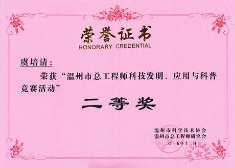 熱烈祝賀我司董事長虞培清榮獲2015年度“溫州市總工程師科技發明、應用與科普競賽”活動二等獎