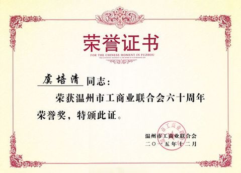 熱烈祝賀我司董事長虞培清榮獲溫州市工商業聯合會六十周年榮譽獎