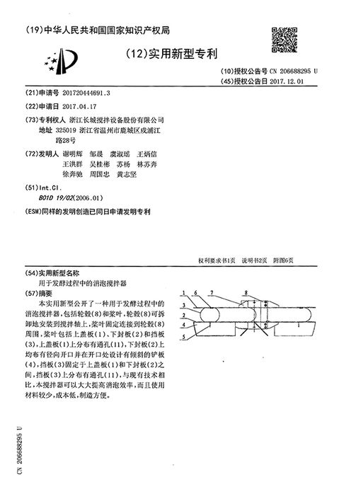 熱烈祝賀我司“用于發酵過程中的消泡攪拌器”獲國家實用新型專利