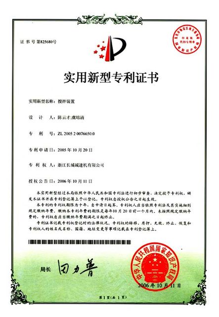 ZL 2005 2 0074405.6    一種耐高溫磁傳動裝置 ZL 2005 2 0075774.7        可帶料更換軸封的攪拌裝置
