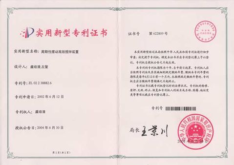 我公司兩項新技術,周期性擺動高效攪拌裝置和底部導流式節能攪拌裝置,獲實用新型專利。