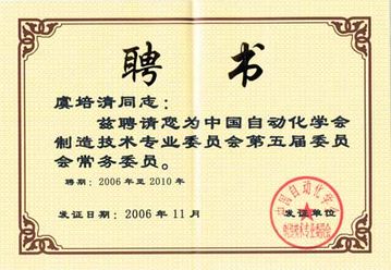 虞培清總經理被聘為中國自動化學會制造技術專委會第五屆委員會常務委員