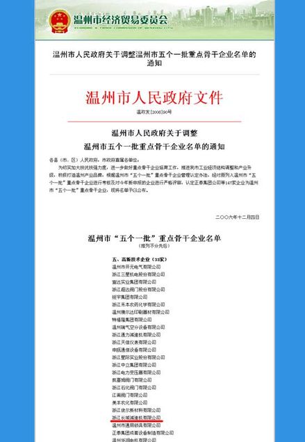 2006年第四批省高新技術企業名單已確定公布,有145家企業符合認定條件,其中溫州市有10家,我公司位列其中之一。