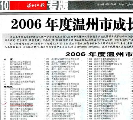 2006年12月14日,《溫州日報》第10版刊登了“2006年度溫州市成長型中小企業入選名單”,我公司位列第17位。