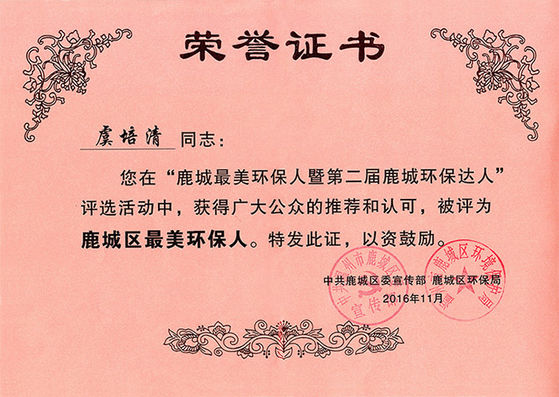熱烈祝賀我司董事長虞培清被評為“鹿城區最美環保人”