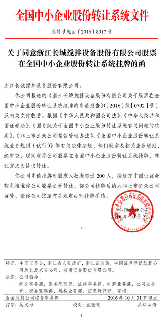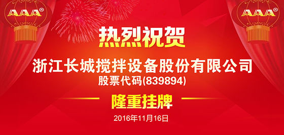 2016年11月16日,浙江長城攪拌設備股份有限公司,簡稱“長城攪拌”,在“新三板”正式掛牌,股票代碼839894。這是行業喜訊,也是我們全體長城人的驕傲。 浙江長城攪拌設備股份有限公司是國內外知名的攪拌技術開發與攪拌...